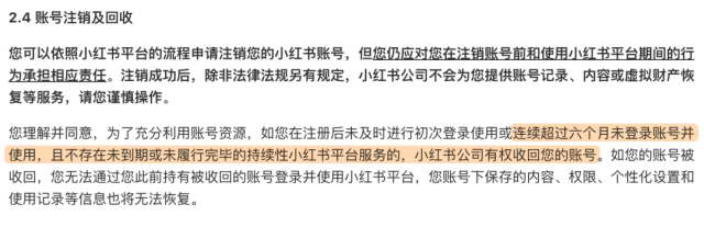 《小红书用户服务协议 》 2.4 里写着,连续超过 6 个月未登录账号且不存在未到期的服务,小红书有权收回账号。