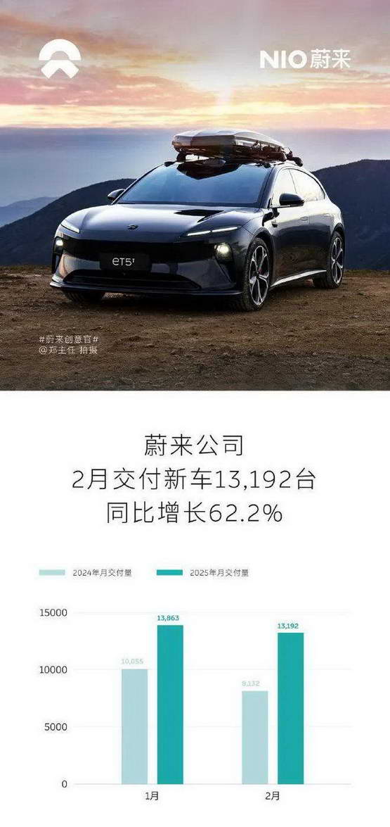 蔚来在 2 月份共交付 13192 台新车,同比增长达 62.2%。