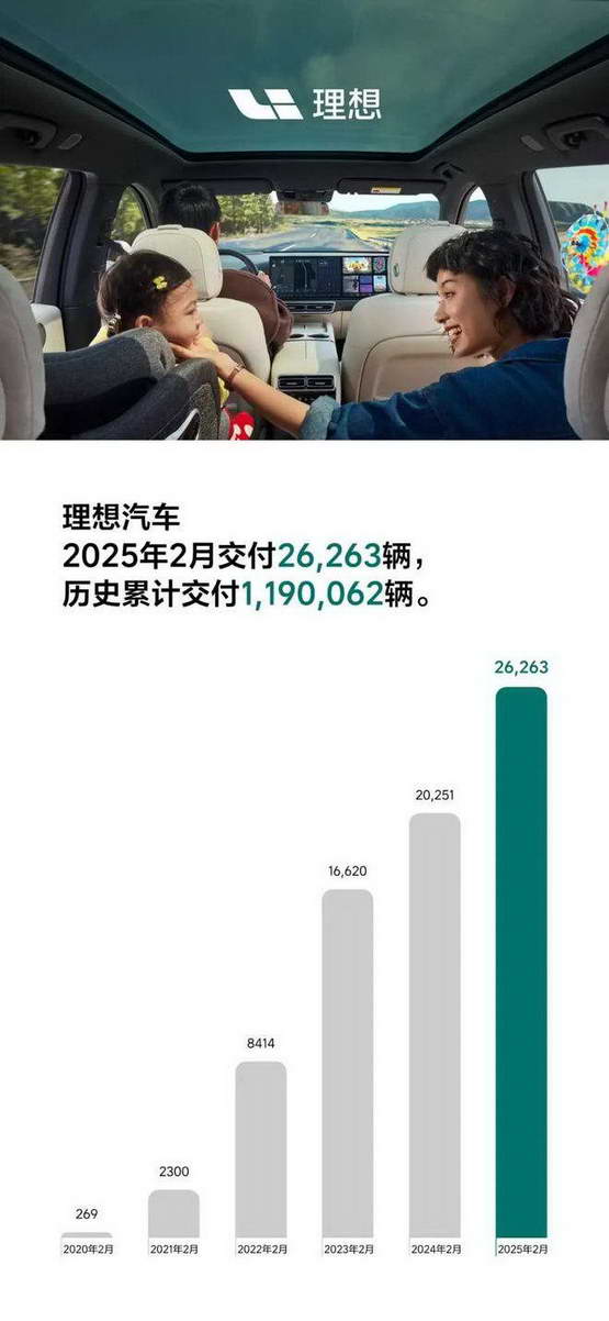 理想在 2 月交付 26263 台新车,相比去年同期增长了约 30%。不过纵向对比 2025 年 1 月的表现,则有一定程度的下滑。