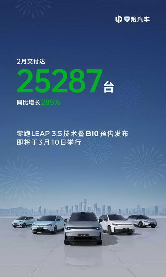 零跑在 2 月份共交付 25287 台新车,同比增长幅度高达 285%。作为对比,今年 1 月零跑同样卖出了约 2.5 万台新车,看来 2.5~3 万台,已经成为了零跑稳定发挥的数据区间。