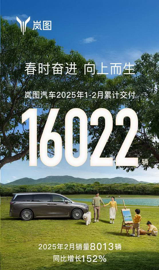 岚图在 2 月交付 8013 台新车,同比增长达 152%,和一月份的表现相差不多;过去两个月共交付 1.6 万台新车。