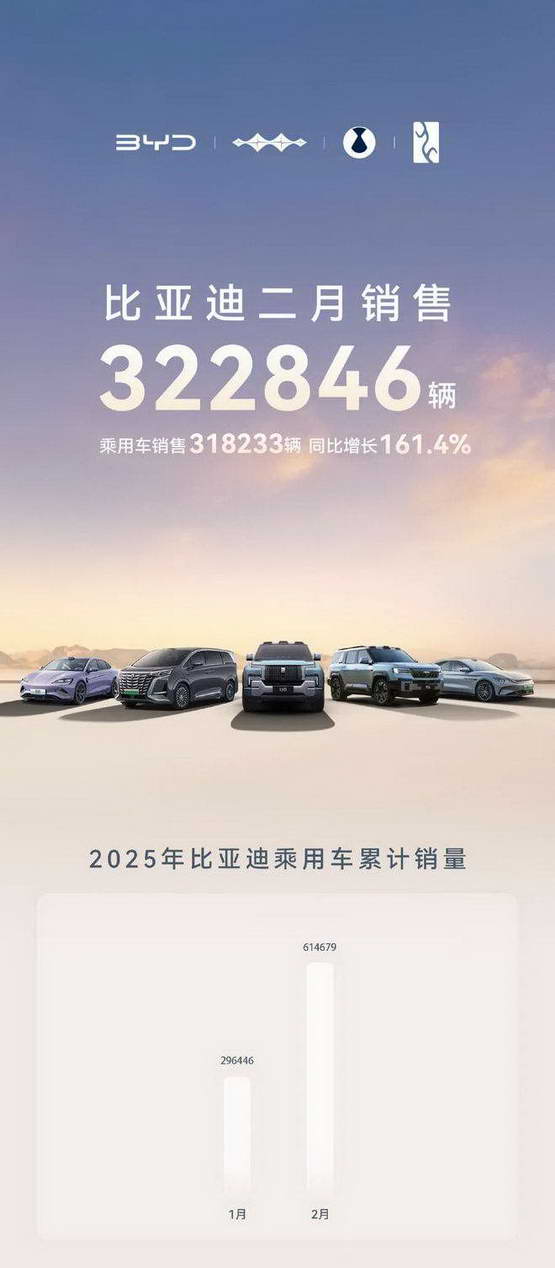2025 年前两个月过完,比亚迪集团的总销量已经来到 61.4 万台,目前来看比亚迪是中国所有汽车品牌中,最有希望完成年度目标(年销 500 万台)的那个。
