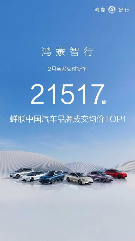 鸿蒙智行全品牌在 2 月共交付 21517 台新车,而 1 月份的数据为 34987 台,环比下滑近 38.5%。