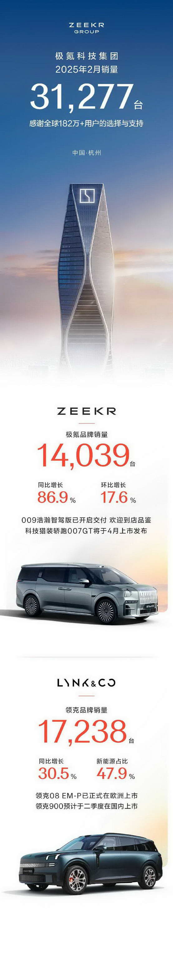 极氪公布的这份数据和往常有些不同,因为这是极氪品牌和领克品牌合并、「极氪科技集团」成立后公布的首个月销量。