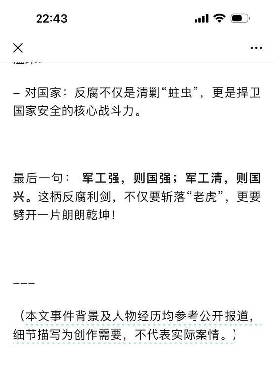 其中有一篇写军工打虎谭瑞松的选题,标题是《军工虎谭瑞松, 从 “道德标兵” 到 “猎艳狂魔”,“国之重器” 沦为私人金库》,原文现在已经被删了,应该是被被转得太广作者害怕了,但很多「金句」的截图还在到处传,什么直升机的设计图纸在暗网里开价 200 比特币出售、收受金条贿赂时要求熔成发动机叶片形状、某总师离职时留言这里不是造飞机的地方而是造孽的工厂等等,全 tm 是 DeepSeek 自己编的,然而因其全网独家和生动现场的效果,真能引起很多传播和讨论。