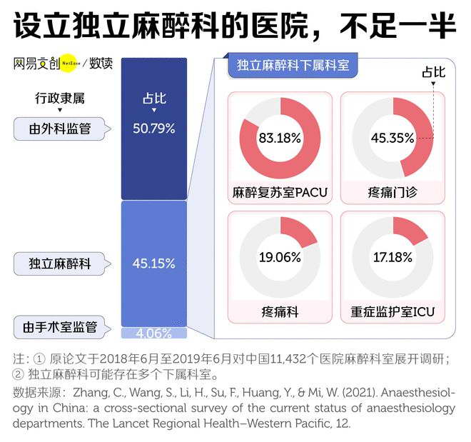 来自上述《柳叶刀》的研究指出,截至 2019 年,在中国 31 个省级行政区的 11432 家医院中,设立独立麻醉科的比例为 45.15%,更多麻醉科还是由外科科室监管,占比 50.79%,此外还有 4% 由手术室管理。相较之下,三级甲等医院独立麻醉科的比例最高 [1]。