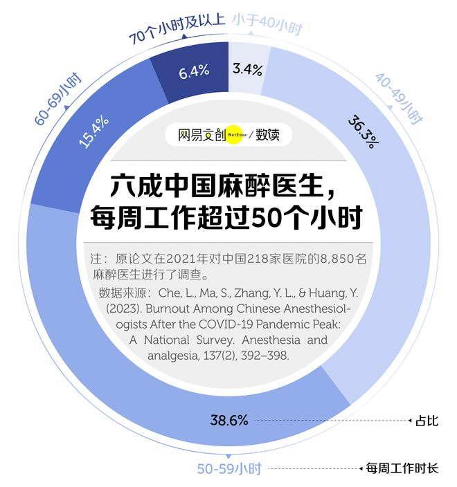一项在 2021 年新冠肺炎疫情高峰后,针对中国麻醉医生职业倦怠情况的全国调查显示,2021 年,中国 60.3% 的麻醉师每周工作时间超过 50 小时,这其中更有 6.4% 的麻醉医生每周工作超过 70 小时 [3]。