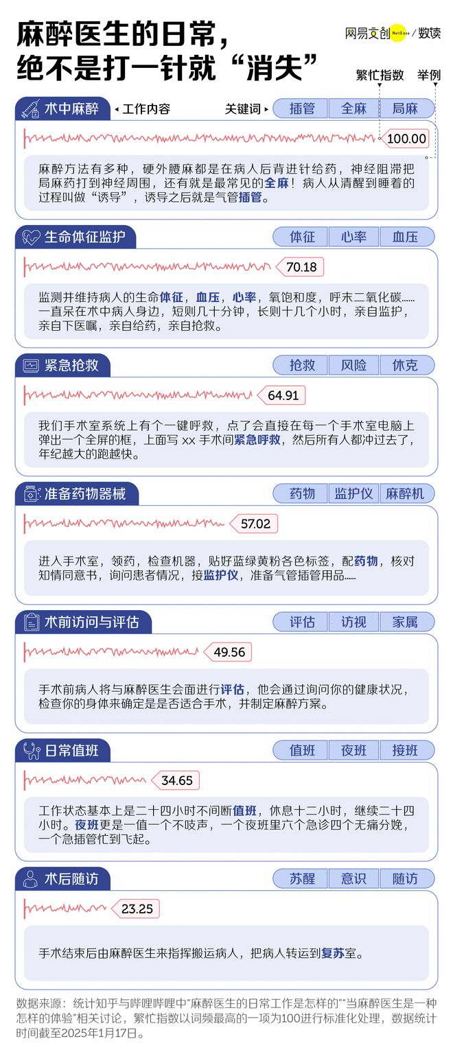 如果说坐在医院行政楼工作的,是按部就班;那麻醉医生的生活,却是围绕手术来转。有时候遇上 24 小时连轴转,黑眼圈便成了他们的 “勋章”。有麻醉医生这么总结道: