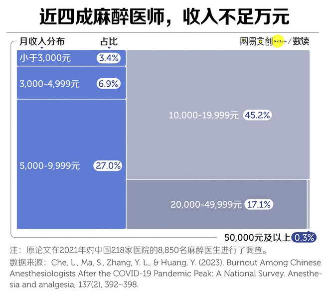 处在收入末位的,大多是刚入行不久,还处于规培阶段的住院医师们,另一项发表在《临床麻醉学杂志》,专门调研这一群体职业倦怠情况的调查显示,接近五分之一的二级及以上医院的麻醉科住院医师收入不到 5000 元 [6]。