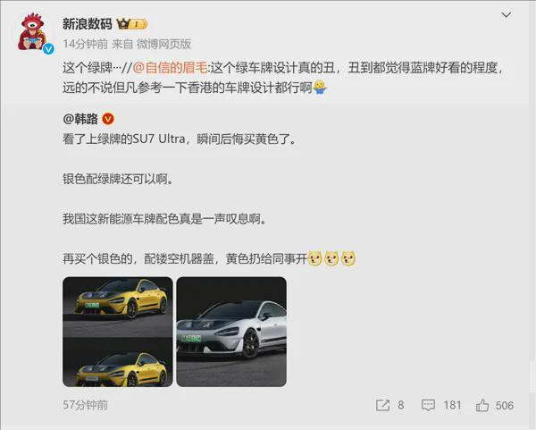 「看了上绿牌的 SU7 Ultra,瞬间后悔买黄色了。我国这新能源车牌配色真是一声叹息啊。」
