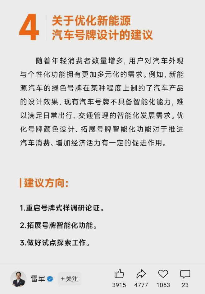 针对这种情况,雷军公布的 2025 两会建议中,提到了关于优化新能源汽车号牌设计的建议。