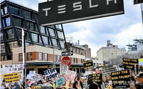 首先是抗议,示威者高呼“没有人投票给埃隆·马斯克”和“寡头滚蛋,民主万岁”的口号,出一大群人直接把特斯拉的门店给堵了,搞“游行示威”活动,反正不让特斯拉做生意。