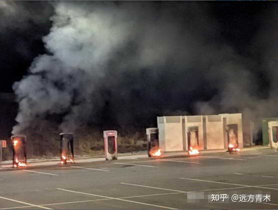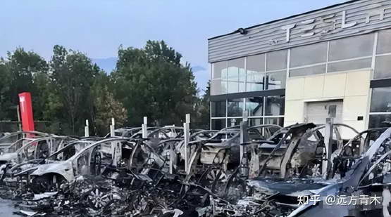 除烧毁充电桩外,特斯拉还有大批汽车被人纵火烧毁。