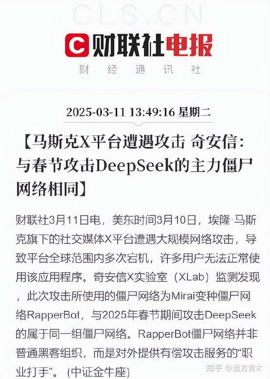 根据检测,攻击马斯克X平台的僵尸网络,和今年春节期间攻击中国人工智能DeepSeek的属于同一组僵尸网络。