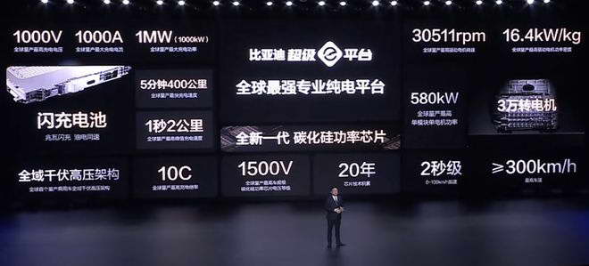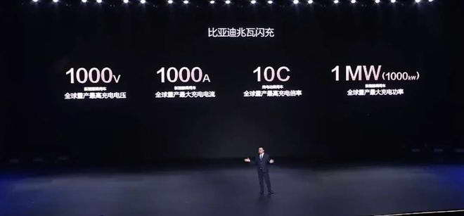 王传福说,比亚迪兆瓦闪充,实现全球首个量产乘用车千伏高压架构。
