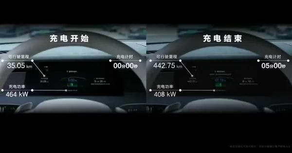 视频显示,充电 5 分钟,续航里程从 35Km 增长到 442.75Km。