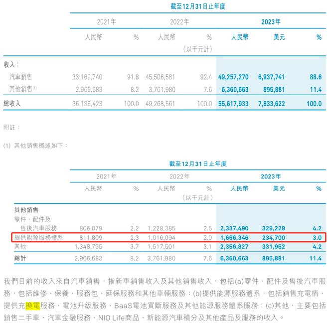 以 2023 年为例,蔚来其他销售收入 63.61 亿,其中提供能源服务体系(即包含充电桩、充换电服务等)的一年收入是 16.66 亿。