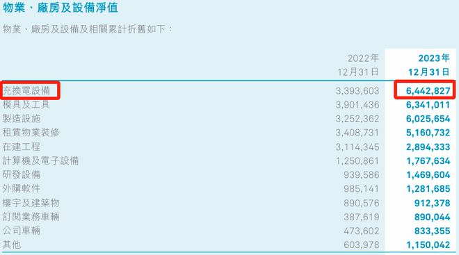 从设备净值来看,2023 年末,蔚来的充换电设备净值为 64 亿,接近翻倍。