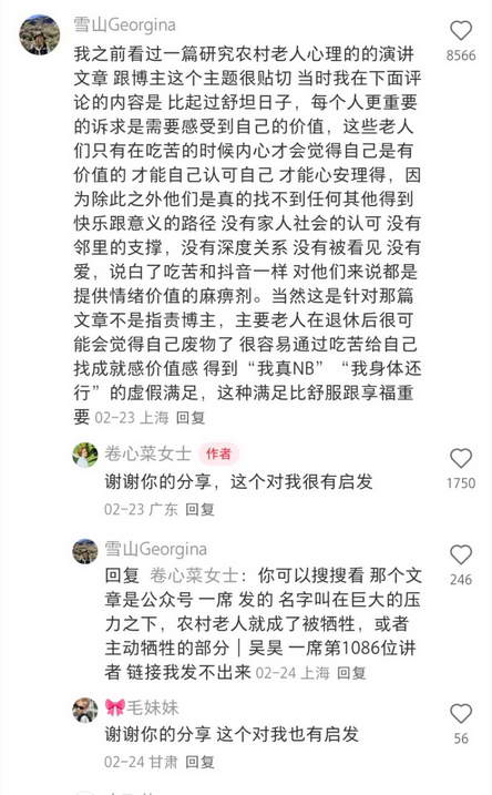 @小野妹子学吐槽: 要是说 “老人吃苦” 和 “青少年自残” 的心理机制差不多,你可能就理解一点点了。这样做可以被看见,可以找到自我确认的坐标。