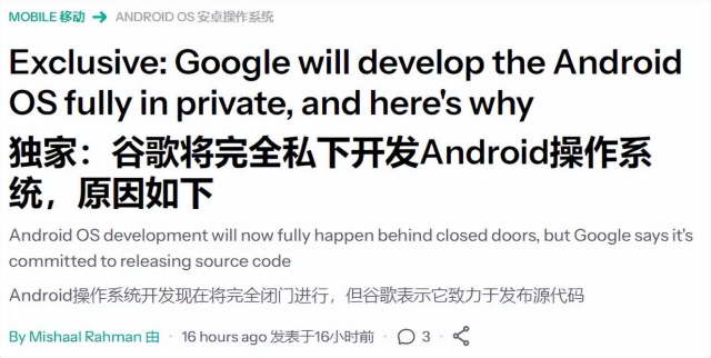 《 独家 | Google 决定终止开源 Android 》。