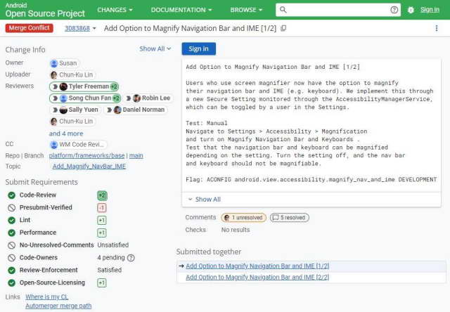 Android Authority 在报道中举了个例子:有个亚马逊的程序员给安卓系统提交了个补丁,允许系统里的放大镜工具放大导航栏以及输入法的界面。
