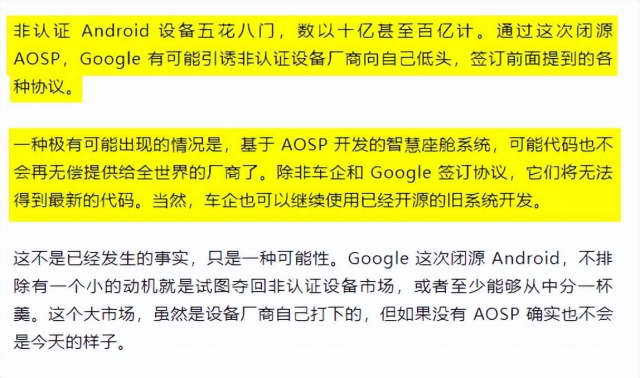 所以这家媒体猜测,谷歌闭源的举动是为了增加营收,倒逼现在正在白嫖安卓代码开发的小公司、车机厂商都来跟谷歌签协议,用钱换新系统的代码。