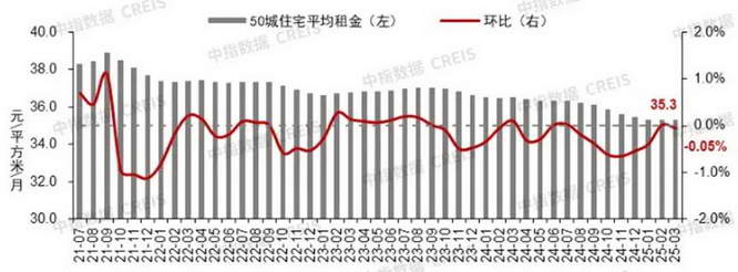 进入 2025 年后,下滑趋势还在延续,3 月 50 个城市住宅平均租金环比下跌 0.05%,同比下跌 3.40%。