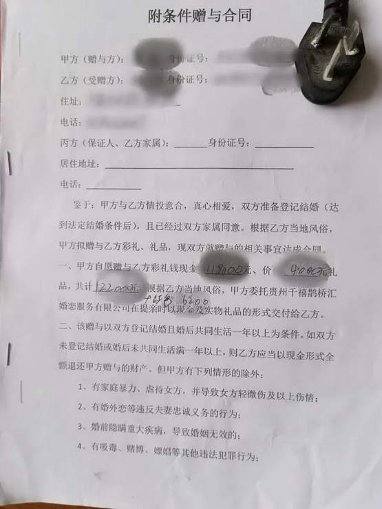 “跨省闪婚” 男女双方签署的《附条件赠与合同》