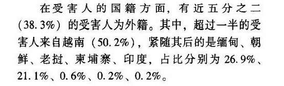2019 年,一篇载于《中国公安大学学报》的论文《我国拐卖妇女犯罪特点及治理策略 —— 基于 1038 份裁判文书的分析》指出,在文章统计的 1662 名受害者中,近 40% 为外籍,主要是越南籍。