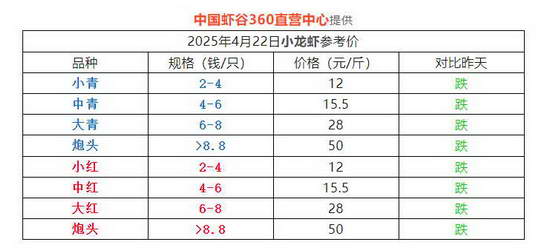 小龙虾垂直电商平台 “虾谷 360”,每天都会发布价格信息。其官微显示,4 月 22 日,4~6 钱 / 只的中青、中红的报价为 15.5 元 / 斤,6~8 钱 / 只的大青、大红报价则为 28 元 / 斤,而且各个规格的小龙虾环比前一日均在下跌。而早前的 4 月 2 日,同等规格的小龙虾价格还为 37 元 / 斤、53 元 / 斤。短短 3 周,小龙虾的价格近乎腰斩。