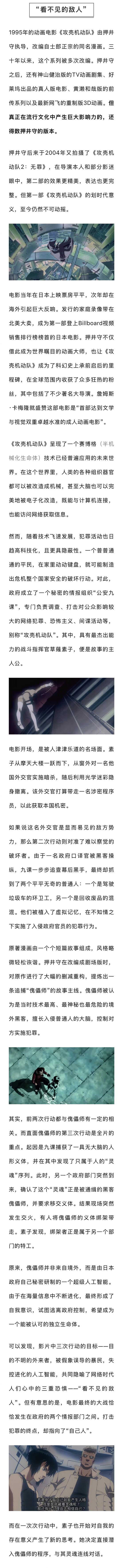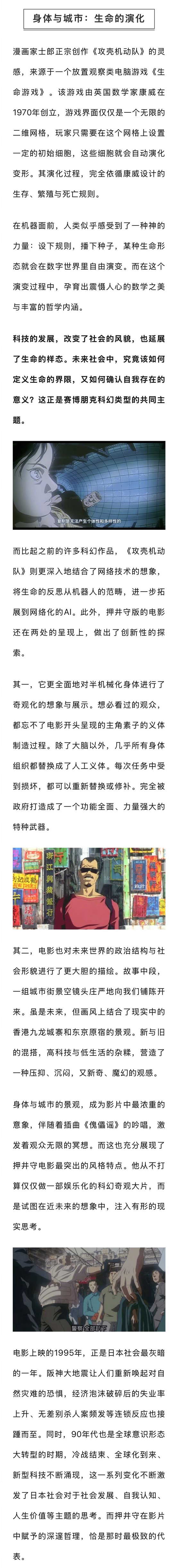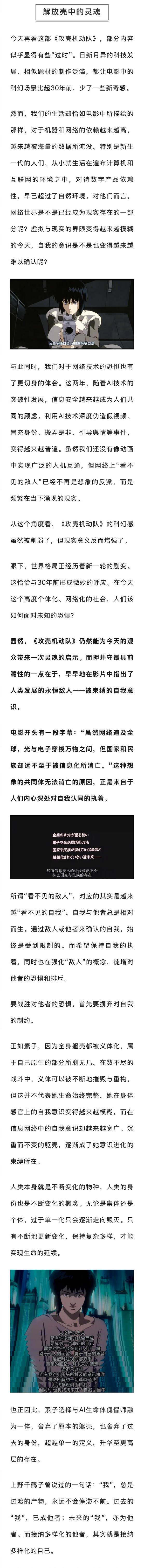 有意思的是,《攻壳机动队》与《幽灵公主》诞生时间相差不过两年,风格和主题却完全不同,刚好代表了日本动画巅峰的两极。宫崎骏在《幽灵公主》中回到了前现代的历史,呈现了人类发展与自然之间的冲突与矛盾。而押井守则用《攻壳机动队》跳到了未来,引领我们思辨人与机器之间的关系。30 年过去了,互联网、机器人、AI 等技术轮番迎来了爆发式发展,人类生活的各个角落都早已离不开科技的绑定。如今,我们还会以怎样的视角,去回顾这部科幻作品,又如何在 AI 时代重新看待生命的意义?