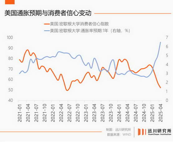 特朗普手上也有一些政绩,比如压低了通胀率(不管是不是他的功劳),抢鸡蛋的风潮在美国也逐渐消停。但在跟全球的关税战争开启后,美国的通胀预期在不断抬头,同时消费者信心也在不断下降。而中国的坚决反击,让局面开始朝着特朗普最害怕的方向发展下去,这是他现阶段无法承受的。