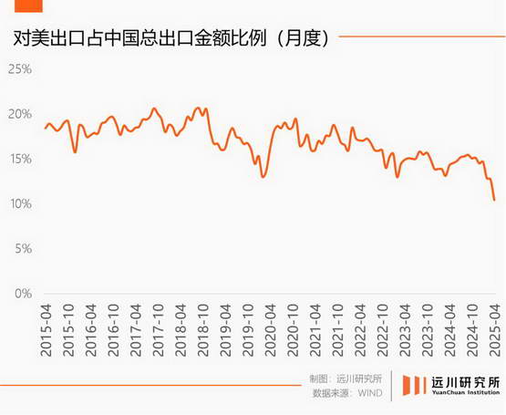 另外,中国在 2018 年对美出口占到了中国出口总金额的 20%,而在 2024 年这一比例已经降到了 14.7%。另外中国对美出口占 GDP 的比例是 2.78%,相较 2018 年的 4.2% 也有了一个显著的下降,在主要经济体中也算中等偏下的水平。这个结构的调整,跟国家这些年大力鼓励企业出海密不可分。