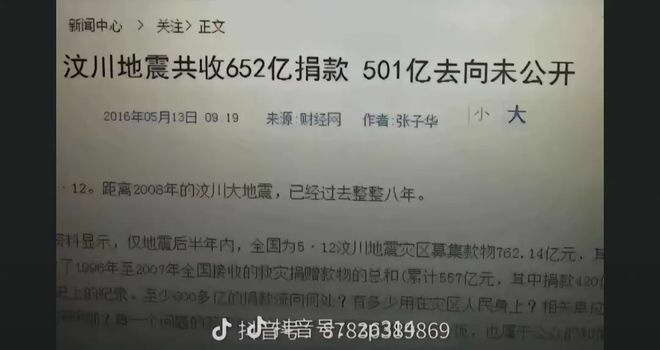 其实,“汶川地震共收到 652 亿捐款,501 亿去向未公开” 这个说法出自 2009 年清华大学的一份报告。报告中的详细表述是:“截至 2009 年 4 月 30 日,社会各界捐赠给汶川地震灾区的的款物总数达到了 767.12 亿元,其中捐赠资金约 653 亿元,物资折合约 114 亿元,其中极可能 80% 左右流入了政府的财政专户,由政府统筹使用,用于灾后重建。”