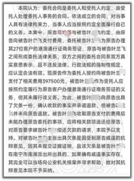 2015 年,经营旅行社业务的黄妈委托叶某办理 27 人的港澳商务签证未果,于是起诉叶某退还 39.75 万元费用。