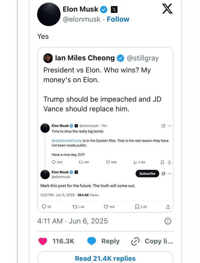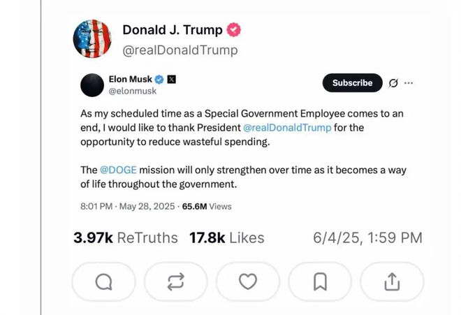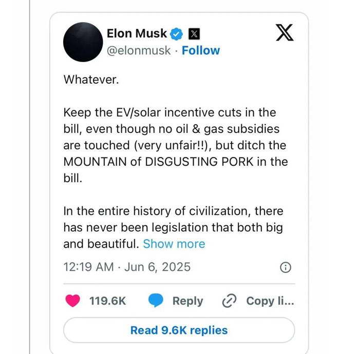 其实在马斯克逐渐淡出特朗普政府后,我就猜到他们俩会有这样一场大撕逼,只是没想到来得如此快,如此猛烈。