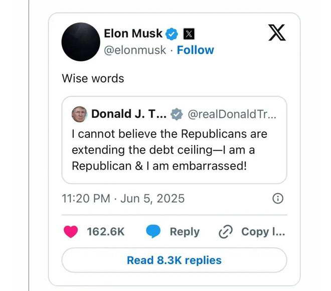 先是挖了特朗普之前发的 “我简直不敢相信,共和党居然又提高了账务上限!作为共和党人我感到耻辱!”