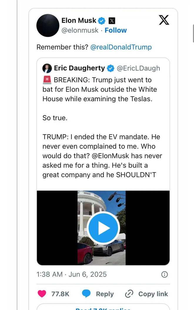 马斯克转发了特朗普在白宫前直播带货特斯拉的视频,@特朗普并表示 “还记得那时候吗?”