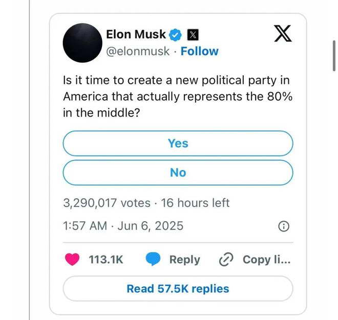 然后马斯克直接发起个投票,询问美国人是不是需要一个新党派:(大部分人选了 yes)
