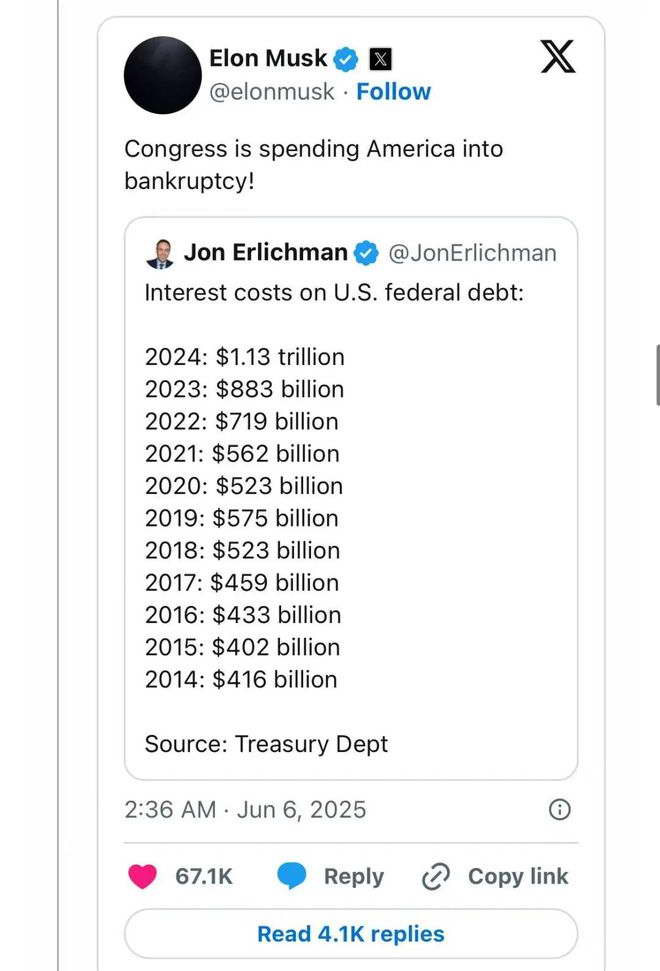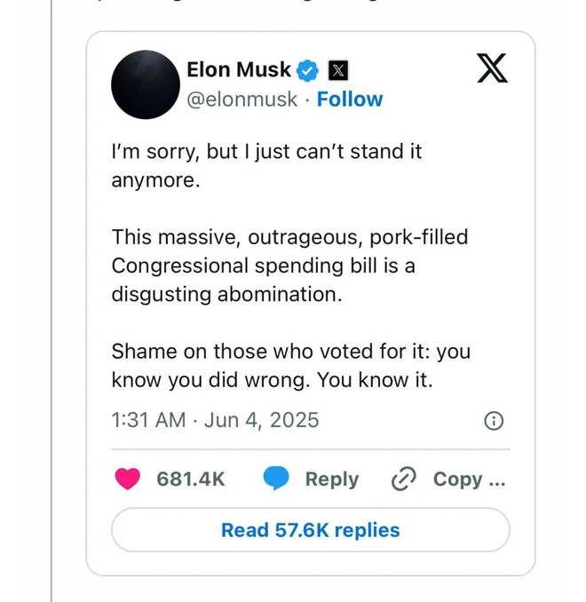 然后马斯克又发了十几条,表示新的预算法案会让美国破产!