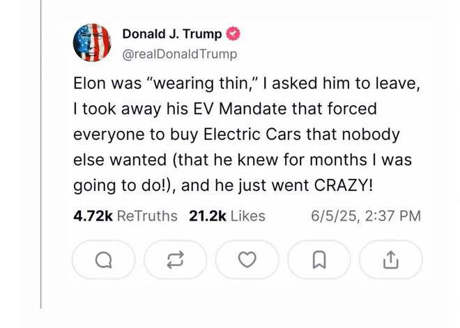 还表示根本没人要买他的电动车,只是因为 EV MANDATE (电动车强制销售政策) 不得不买。现在特朗普要把这个政策取消,马斯克就疯了。