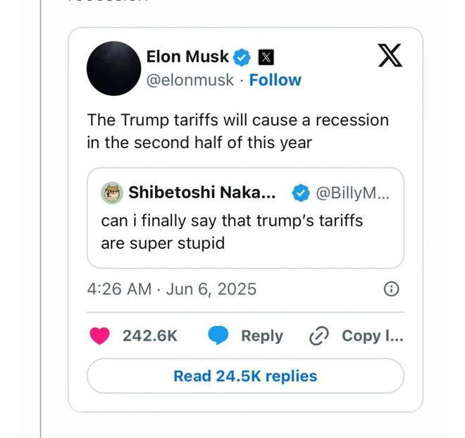 马斯克表示特朗普的关税会让美国陷入衰退。