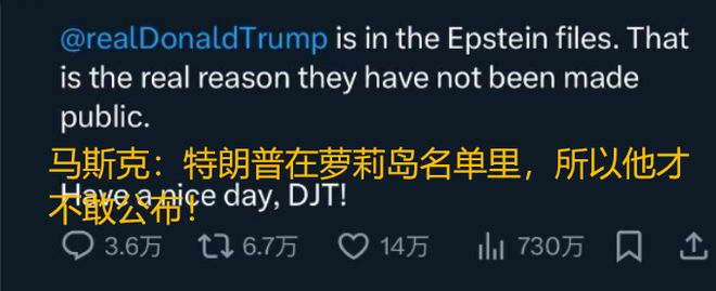 这把马斯克彻底点燃了,他爆料说特朗普根本就在爱泼斯坦萝莉岛的名单上,所以他根本不敢公布名单!