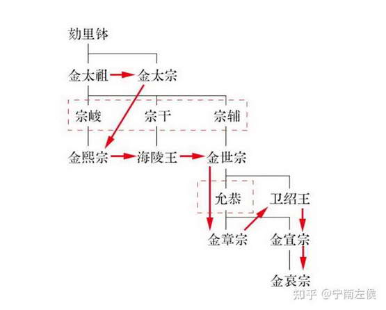 不过金朝的皇位承袭简直噩梦一般。金朝不算完颜承麟是九位皇帝,但从 1115 年阿骨打起兵开始,开国百年愣是没有出现过父死子继这回事,一直等到贞祐南迁南迁之后,大金只剩半口气的时候,才出现第一次父死子继,太子完颜守绪接了爸爸金宣宗的班。