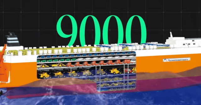 这空间利用的,一看就很能装。现在最大的滚装船,一艘船能装 9000 多台车。