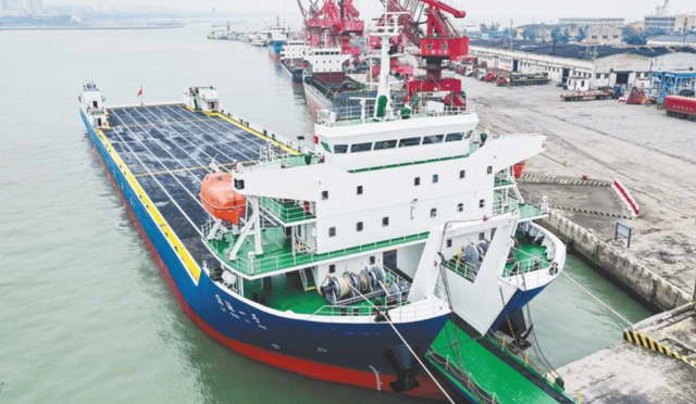 它有一块跳板通向港口,车子可以开进船舱内。在船舱里头,相当于是一个立体停车场,它是通过多层甲板以及斜坡通道或者升降台的设计,让车子能够在不同层间上下通行。