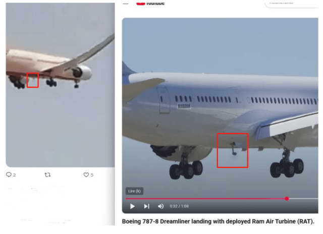 而在 787 上,RAT 装置是默认打开的,也就意味完全不需要飞行员手动操作,只要检测到发动机停机,RAT 会马上放下来。而视频中那个模糊的凸点,位置也跟 787 RAT 的位置比较吻合。