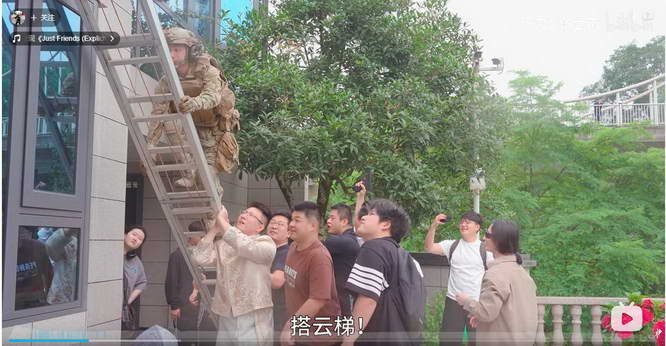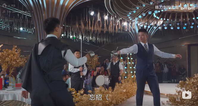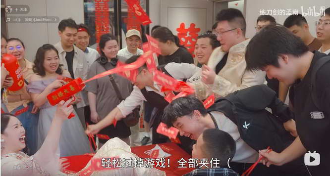 开场是新郎带着自己的山寨兄弟,到新娘子家准备抢亲。这里复刻了让子弹飞的名场面 “枪在手跟我走” 和 “今天我来只为了三件事”。抢亲队通过单兵突袭攻破了新娘子家的大院围墙,又用云梯攻城突破了阳台直接进入闺房。绕开了重兵把守的大门和楼道。抢亲队顺利过掉接亲游戏,带着抢到的新娘子到了婚礼现场。