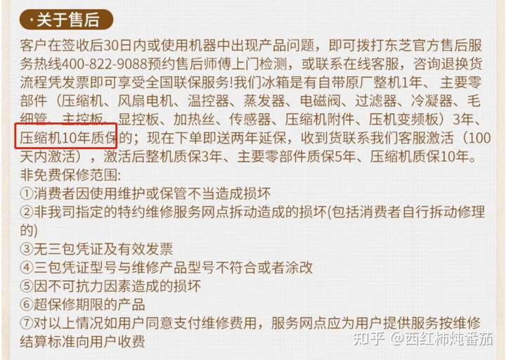 随便找个冰箱的详情页,拉到最底部,直接找售后政策,都会有「压缩机 10 年质保」的字样 ▲