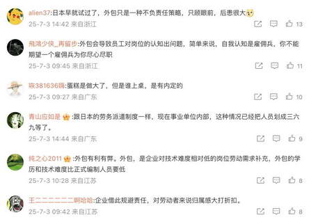 @组织二号头目:我总有种不好的感觉,现在大规模使用外包和劳务派遣,可能对职场产生非常不好的影响。不仅职场,可能年轻人对工作的观念也会重塑,如果一个年轻人一毕业就去干外包,总是觉得他和那些正常入职的观念永久性有分歧了。现在还没想好,就是觉得现在外包有点越来越过分的趋势。 ???